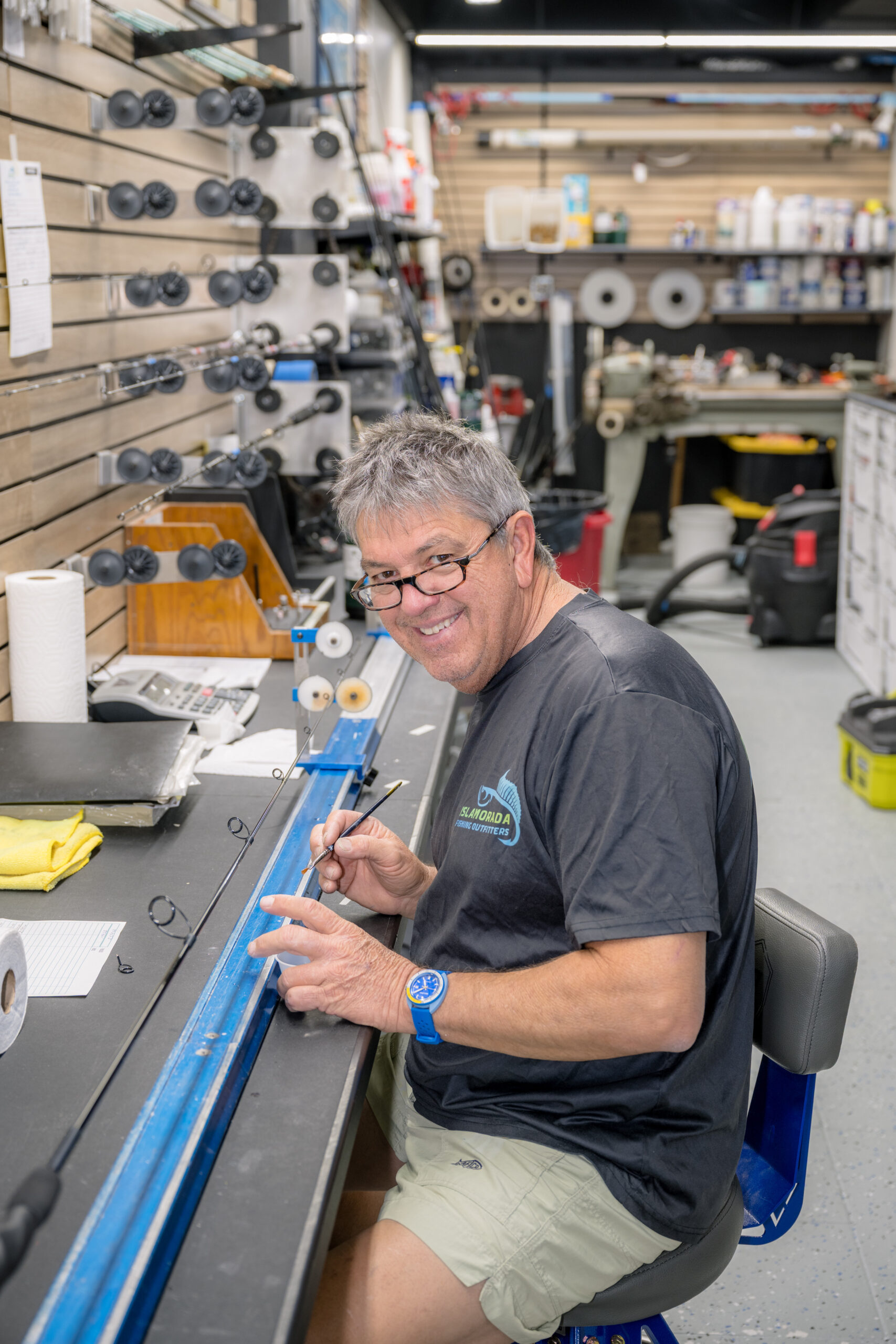 The workshop is laid out with old-school precision—stations for each stage of rod building, from raw blanks to finished masterpieces. Customers can watch Randy and his assistant, Evan Lindo, wrap guides, shape grips, and apply the finishing touches that transform components into completed fishing rods worth hundreds or even thousands of dollars.